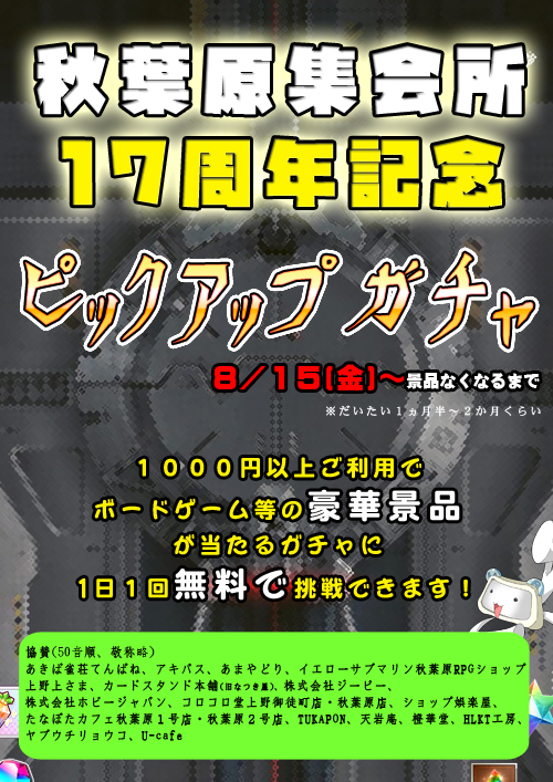 秋葉原集会所17周年ピックアップガチャ開催!