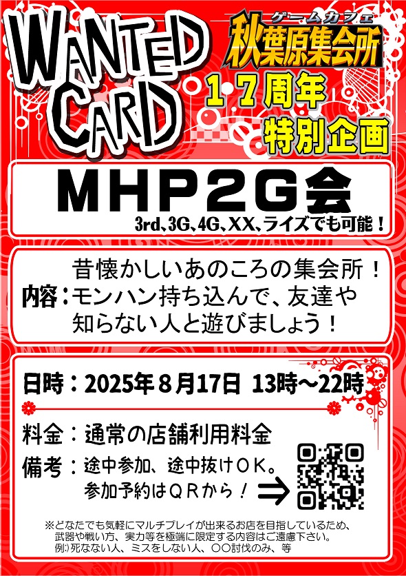 秋葉原集会所17周年を記念して、モンハンで遊ぶ会を開催します。