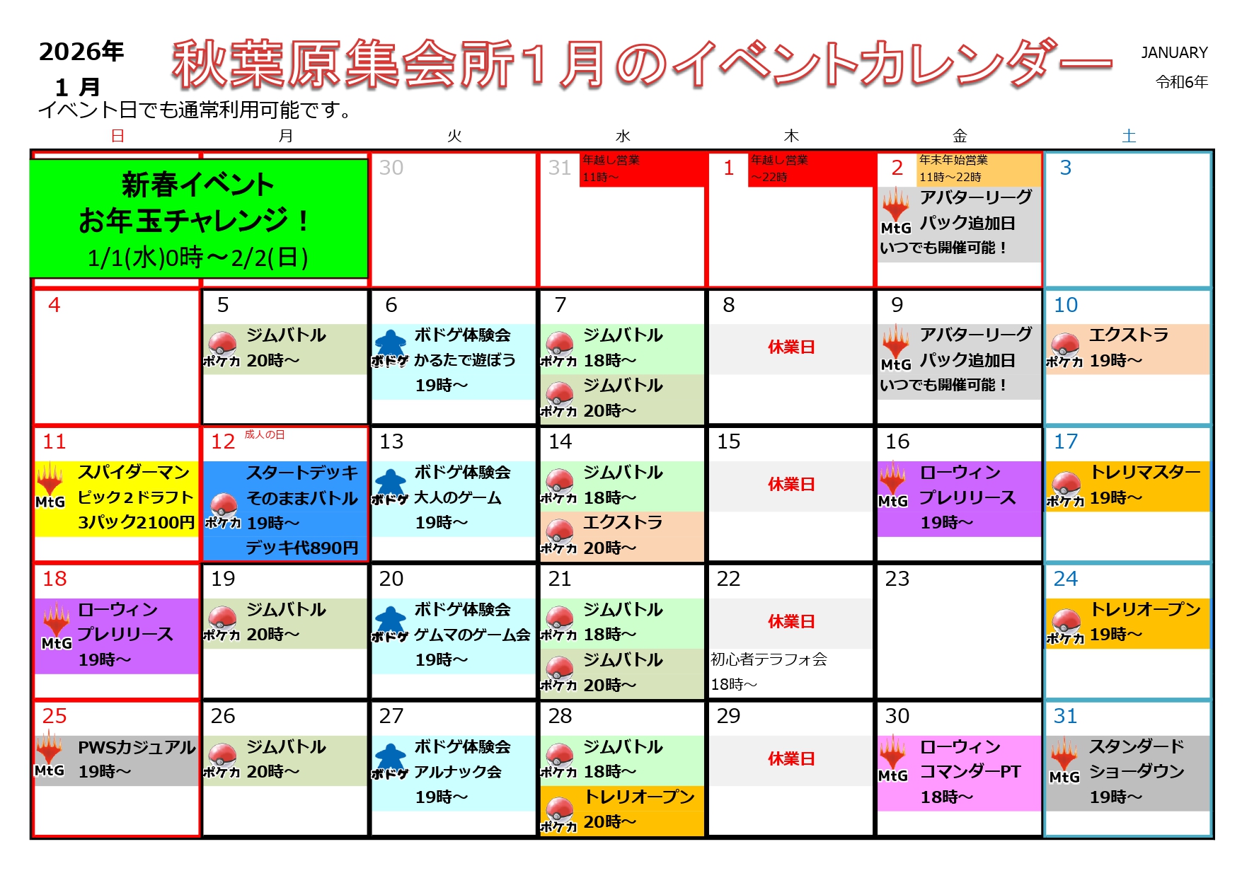 2026年1月は画像の通りイベントを開催します。