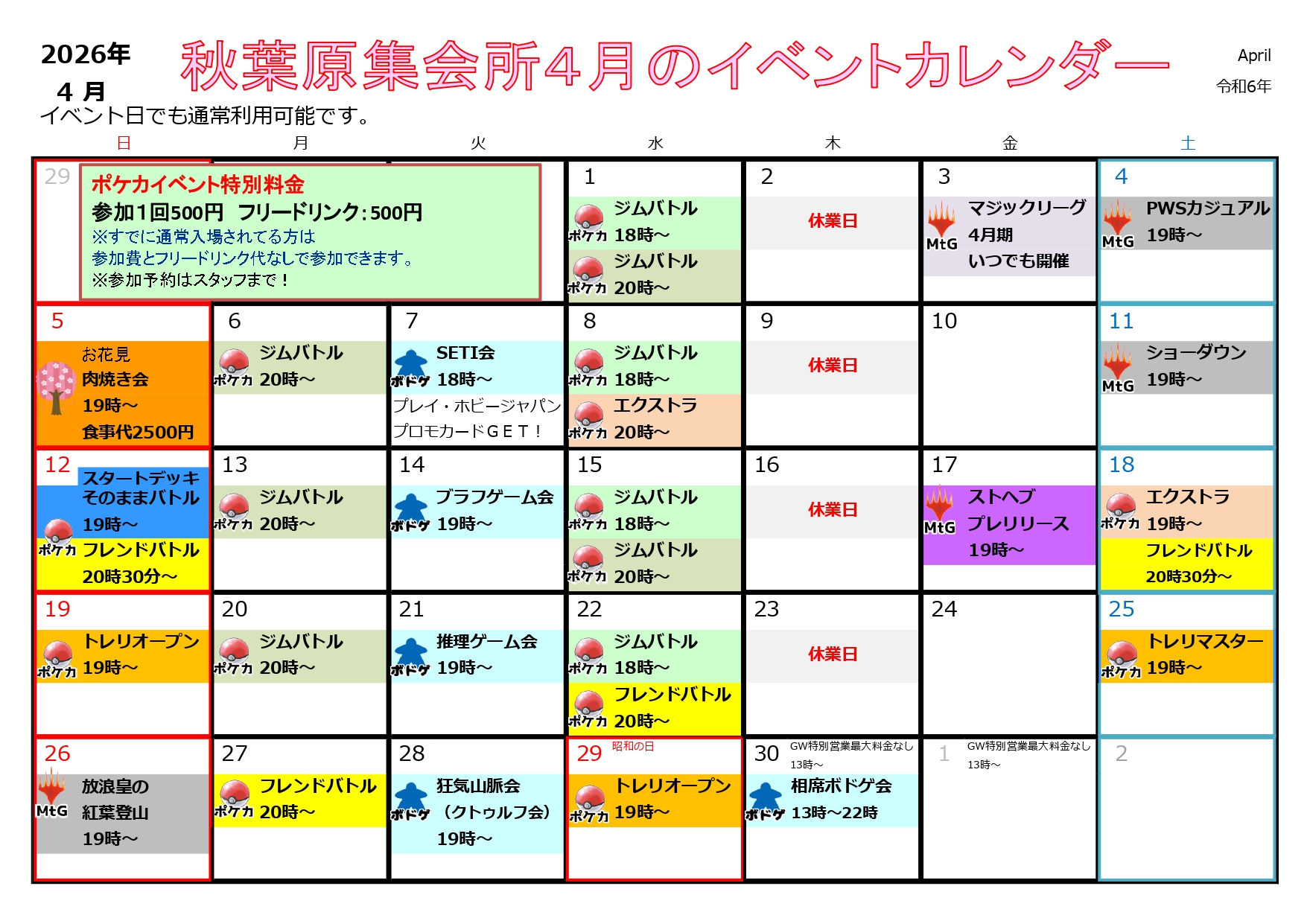 2026年4月は画像の通りイベントを開催します。